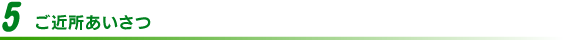 数日に亘る工事では例え屋内のみの工事であっても御近所様にあいさつをいたします。つい御迷惑をお掛けしてしまい、又御協力をお願いしたい事は「車の駐車」やしばらくの間の「騒音」です。清潔を精一杯心掛けますが、多少のゴミ類も飛散して御近所の方にご迷惑をお掛けすると思います。